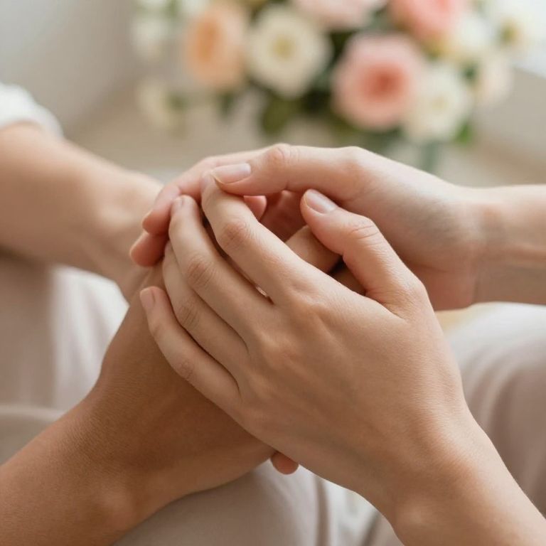 This photograph depicts two pairs of hands gently clasped together in the center of the image. The hands are light-skinned with neatly trimmed nails. In the blurred background, there is a bouquet of soft pink, white, and peach-colored flowers, adding a warm and comforting feel to the scene. The person on the left is wearing a white shirt, while the person on the right's clothing is not fully visible. The lighting is soft and natural, enhancing the tender and intimate atmosphere. The focus is on the hands, emphasizing a sense of connection and care.