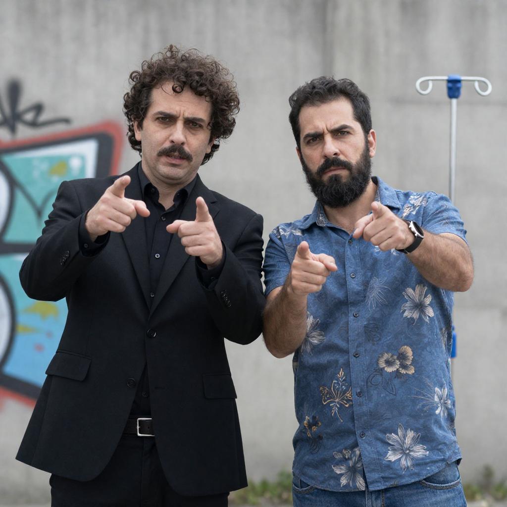 Photograph of two men standing outdoors. Man on left has curly hair, mustache, black suit, and gestures with hands raised. Man on right has short dark hair, beard, blue floral shirt, and also raises hands. Both point forward. Background includes concrete wall, graffiti, and IV stand. Both men have intense expressions.