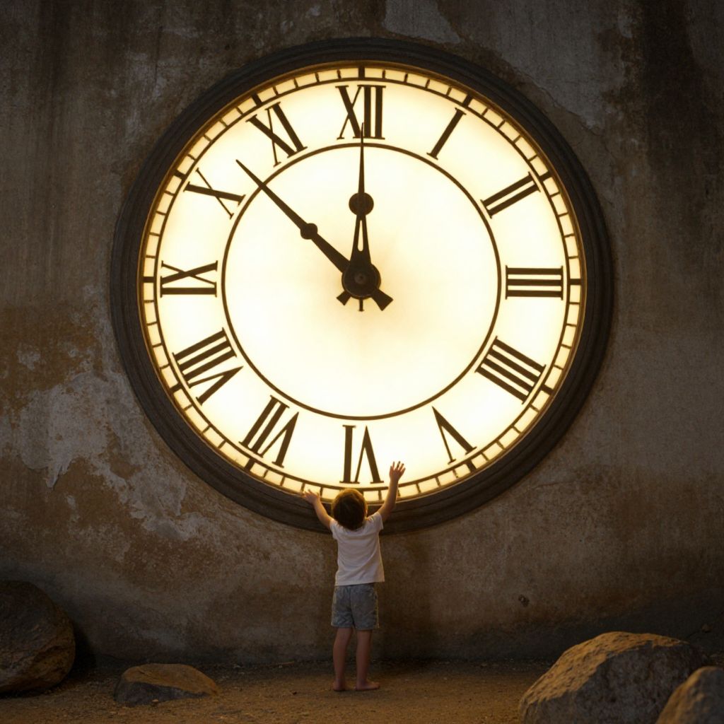 A child stands barefoot, reaching out to adjust the hands of a massive, glowing clock with Roman numerals, as its radiant face illuminates the surrounding rocky ground and weathered wall.