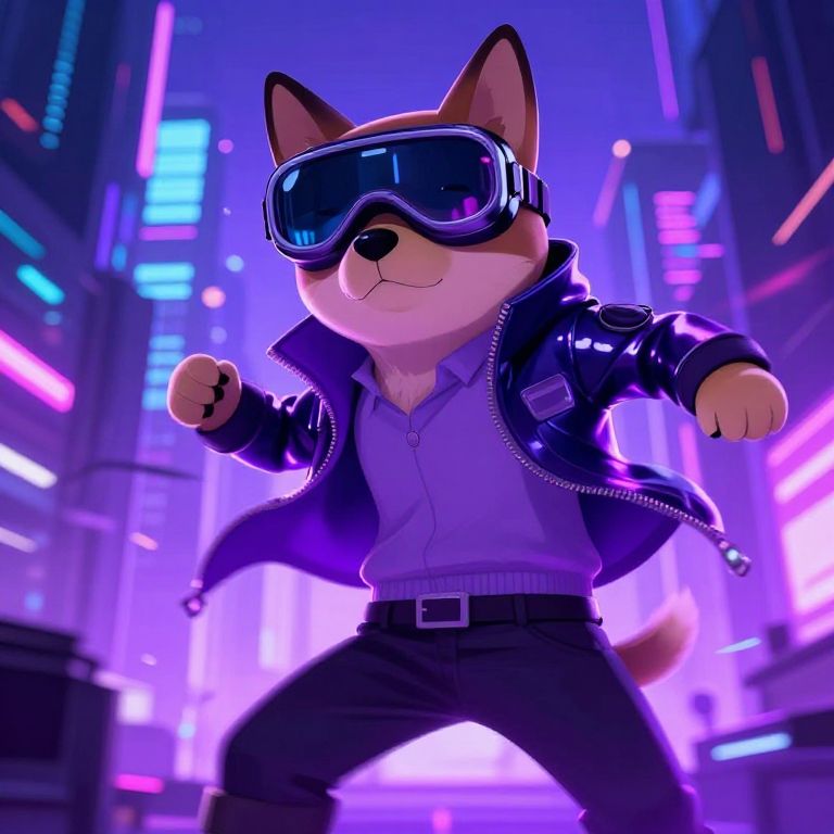 Anime Doge character in futuristic cyberpunk city, neon lights reflecting off its shiny coat, wearing goggles and a cool jacket, dynamic pose with motion blur, detailed anime-style architecture in background, vibrant purple and blue palette, action-packed mood