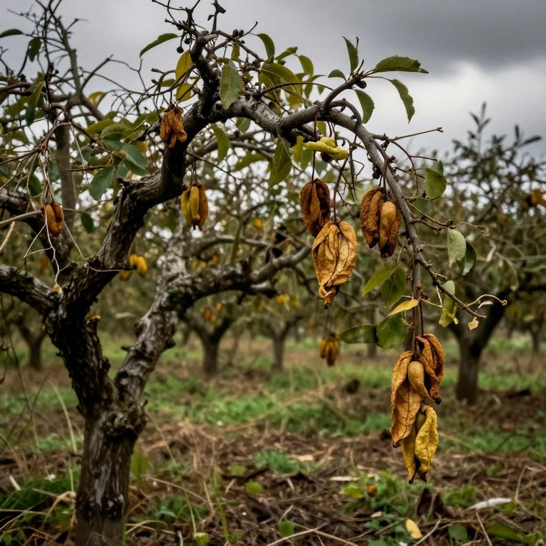 Photograph of an orchard with a focus on a single, gnarled tree in the foreground. The tree's branches are dark and twisted, adorned with withered, brown, and yellow fruit pods hanging from the leaves. The background features a row of similar trees, slightly out of focus, under a cloudy, overcast sky. The ground is covered with green grass and scattered dry leaves, adding a sense of natural decay. The overall mood is somber and autumnal, with muted colors and a textured, rustic feel. The image captures the essence of an orchard in late harvest season.