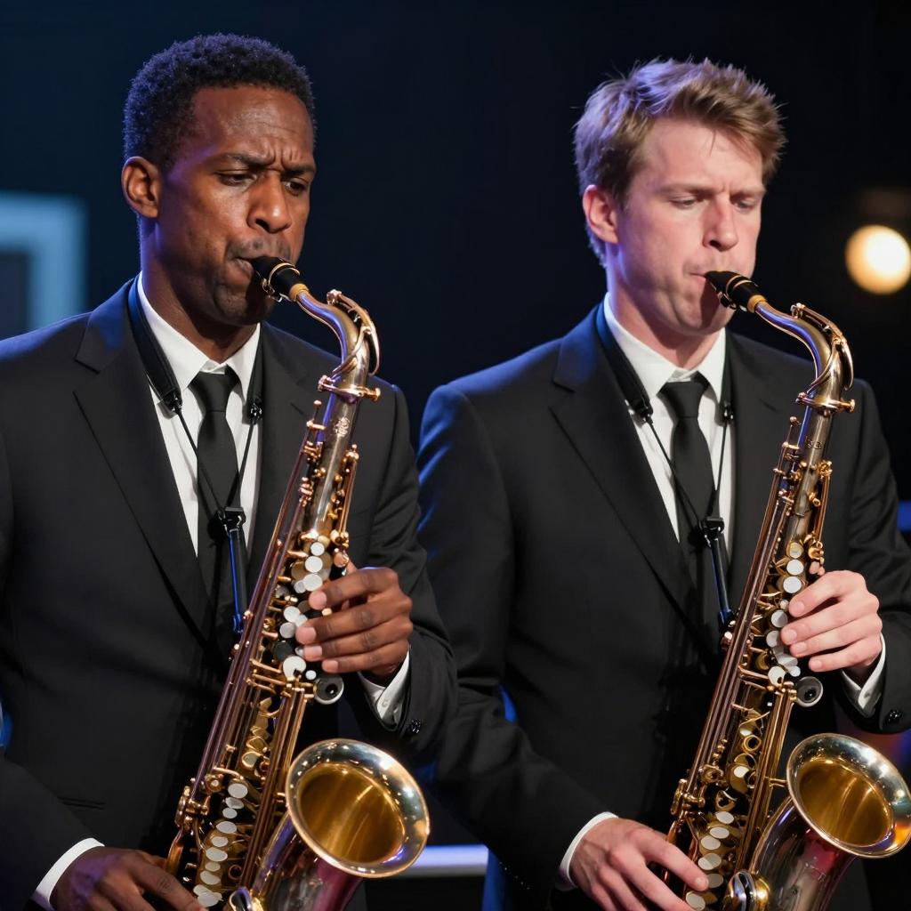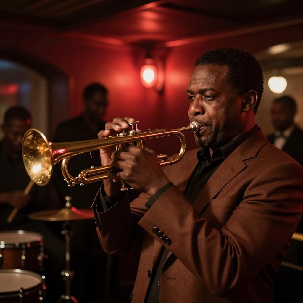 Photograph of two African American men with beards, intense expressions. One man plays a trumpet, mouthpiece in mouth, eyes closed. Other man looks at him, slightly open mouth. Both wear dark clothing. Background has blurred, ured, vertical shapes. Sunlit, warm color tone.