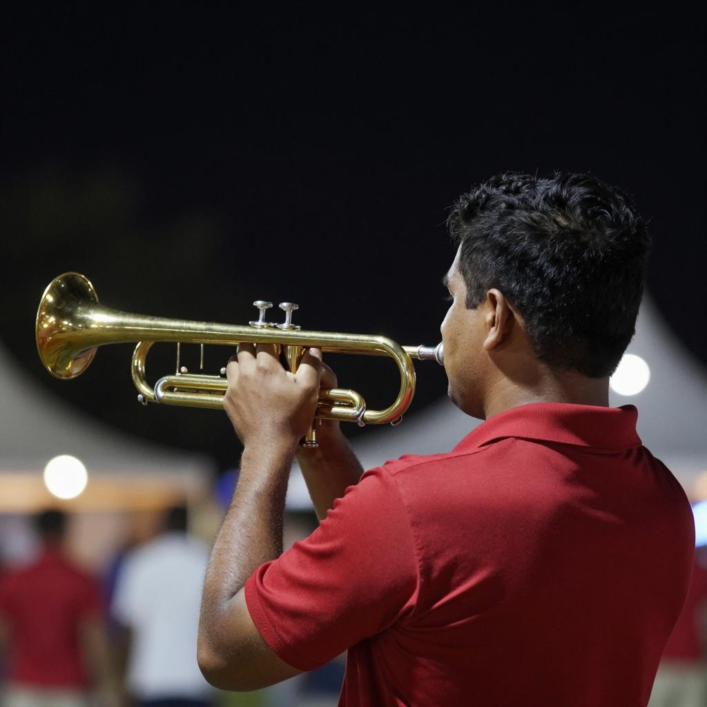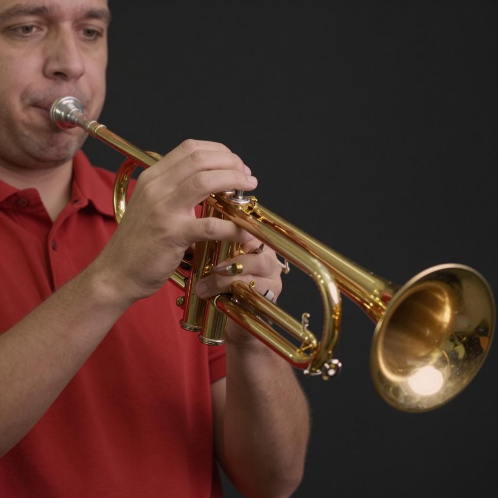 Close-up of two African American men with beards intensely playing trumpets. The man in the foreground has his eyes closed while playing, wearing a dark t-shirt. The second man is slightly blurred in the background, looking on intently. Both men are outdoors with a sunlit background and warm color tones.