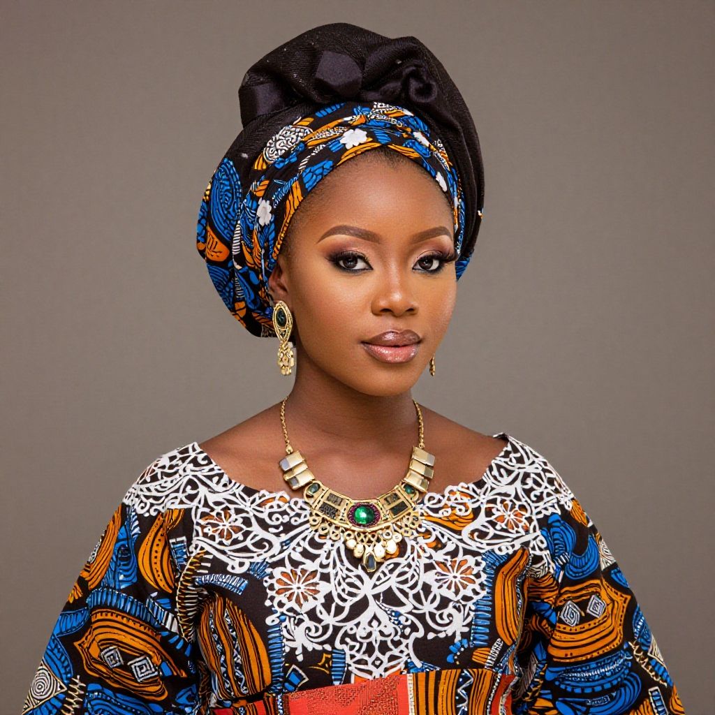 Photograph of a dark-skinned woman with black headwrap, patterned dress, gold necklace, earrings, and confident expression against gray background.
