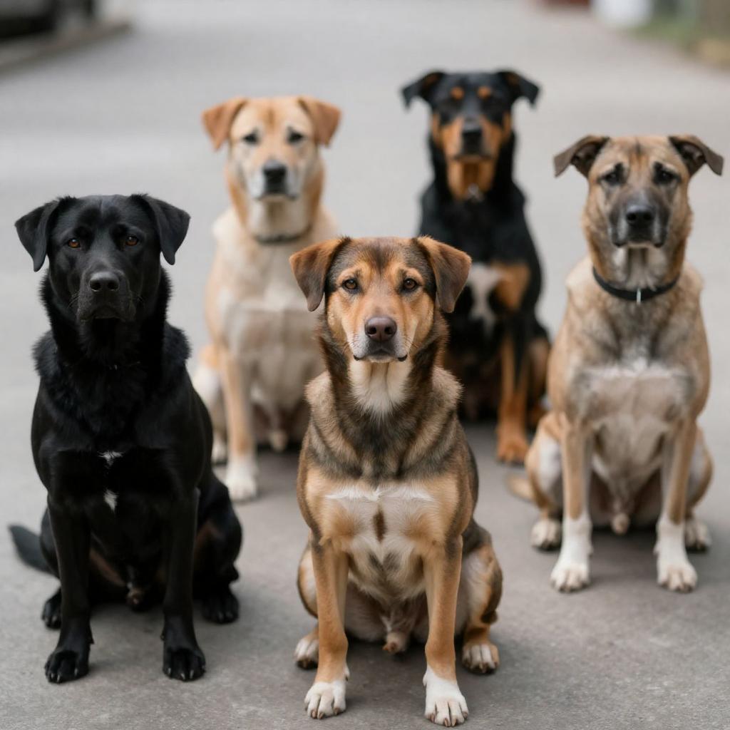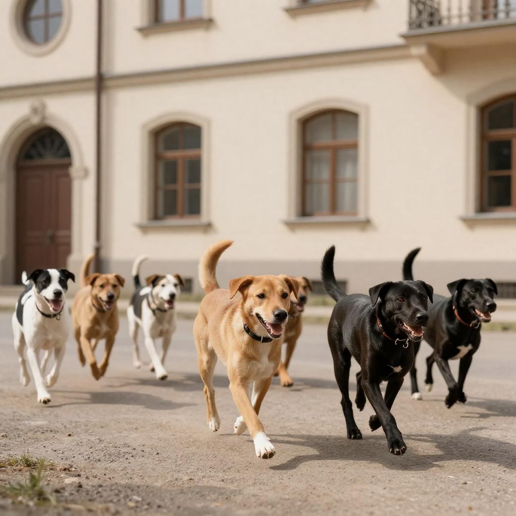 Photograph of a group of dogs, including a tan and a black dog in the foreground, running down a sunlit street. The background features a beige building with arched windows and a circular window. The street has a ured, gravel surface with shadows. The dogs' fur contrasts with the building's smooth ure.