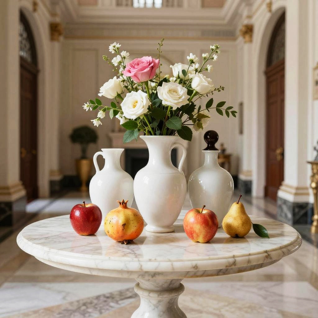 Neo-classical marble relief, round marble pedestal table in a grand hallway, still-life featuring three white vases of varied shapes and a small brown bottle with a dark top; pink roses and white flowers with lively green leaves; fruits arranged around them: a red apple, a yellow-orange pomegranate, another red apple, and a small brown pear with a green leaf; natural diffuse skylight from above; realistic textures, crisp edges, gentle reflections, soft falloff, color-true, editorial quality