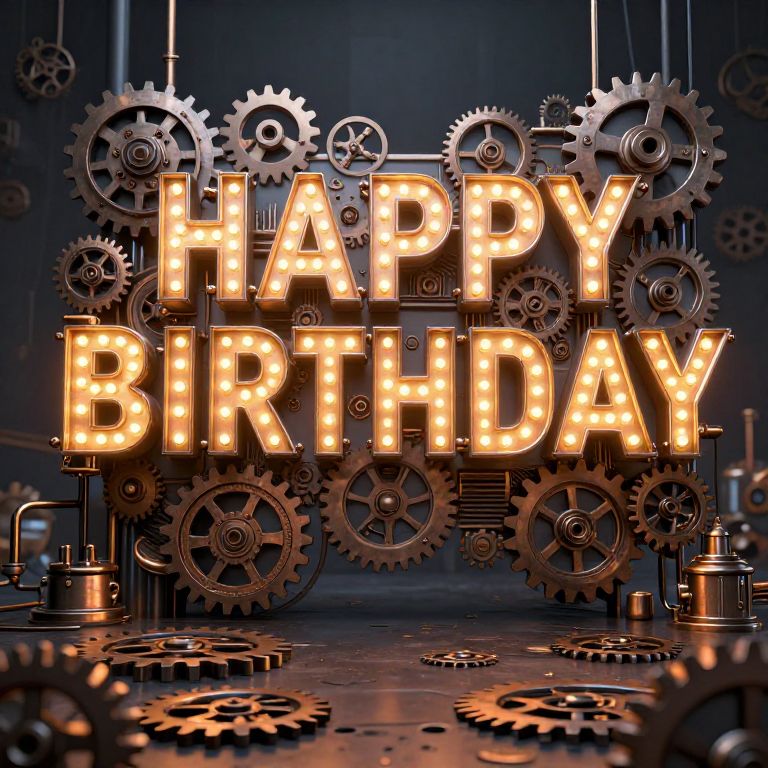 Metal happy birthday scene with intricate steel sculptures forming festive letters, glowing LED lights illuminating the message, surrounded by gears and industrial elements, dark moody background, steampunk art style, vibrant metallic colors, 3D rendered.