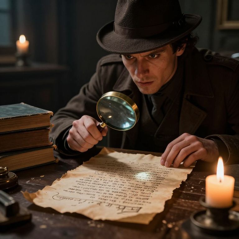 A mysterious detective holding a magnifying glass over a cryptic clue etched on an ancient parchment, surrounded by old books and flickering candlelight, intense expression, moody background, detailed textures, noir aesthetic.