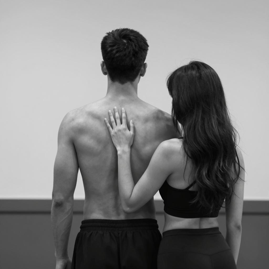 Black and white photograph showing the back view of a young athletic couple. The man has short dark hair, a muscular back, and is shirtless wearing dark shorts. The woman has long dark hair, a slender build, and is dressed in a black sports bra and high-waisted leggings, with her right hand resting gently on the man's shoulder. The scene is captured indoors against a plain light-colored wall with a dark horizontal band at the bottom.