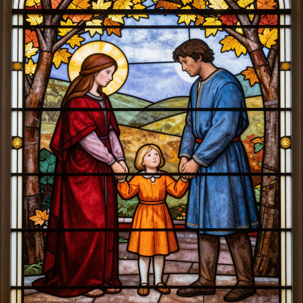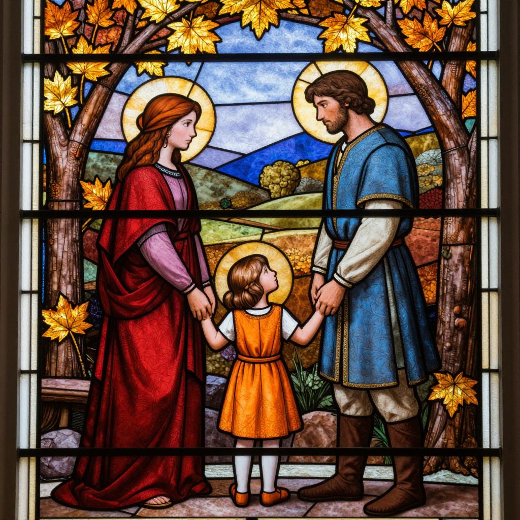 Family depicted in a vibrant stained glass window scene, with warm autumnal hues and golden leaves framing a tender moment of three individuals—a woman in a red robe, a man in a blue tunic, and a child in an orange dress—holding hands and gazing affectionately, symbolizing unity and gratitude.