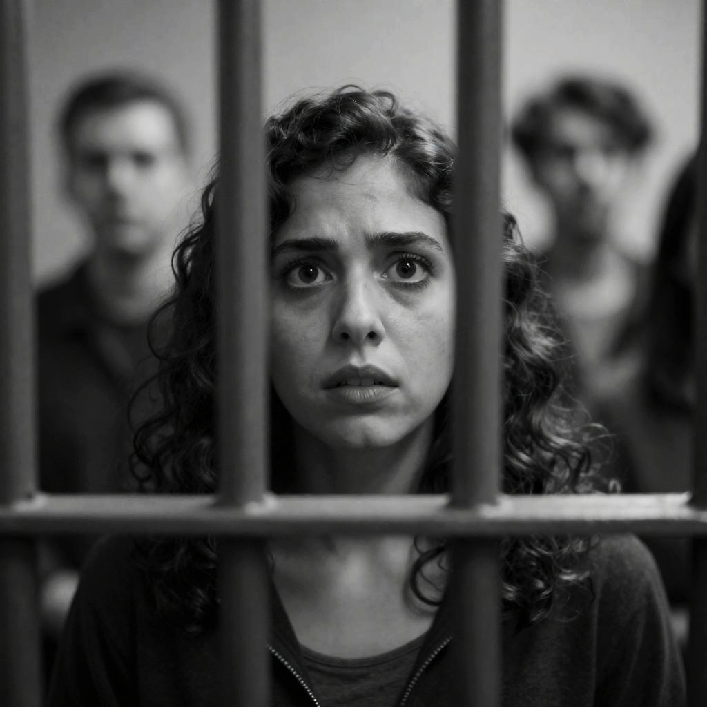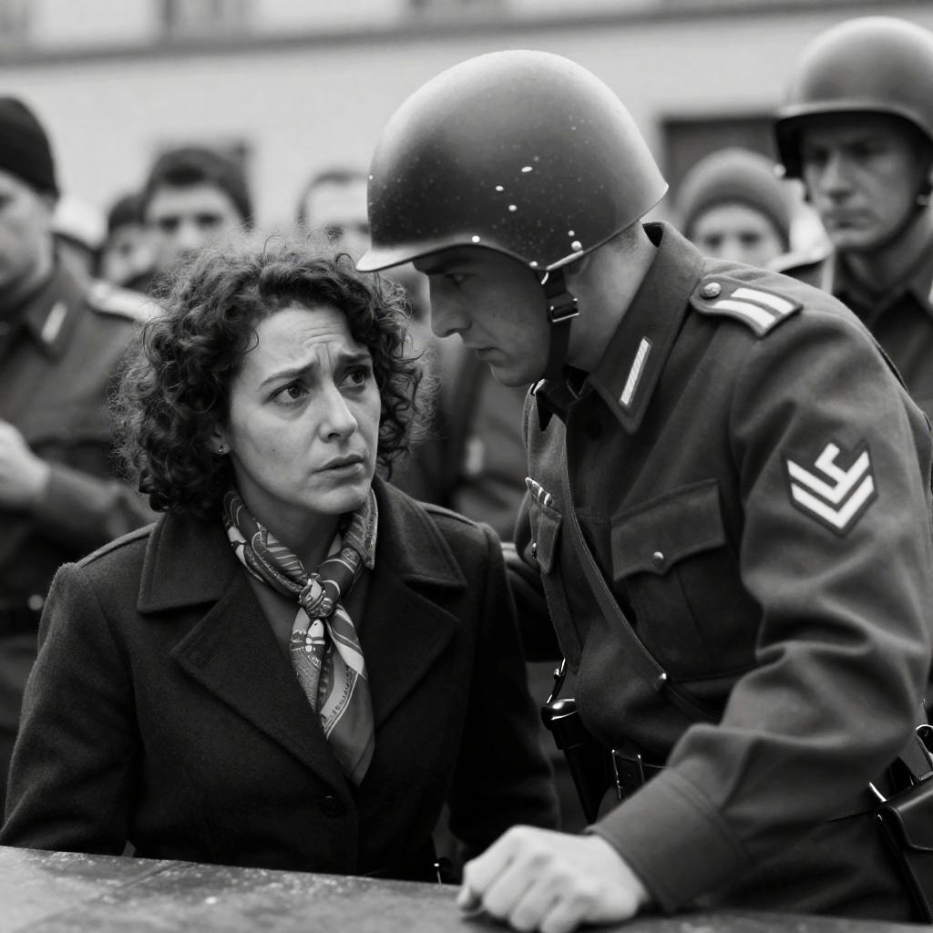 Black and white photograph. Soldier in helmet with swastika, dark uniform, and insignia leans close to woman with curly hair, dark jacket, and patterned scarf. Intense expressions. Crowded background with several indistinct people. Soldier's face partially obscured. Woman looks worried. Soldier's right hand on table.