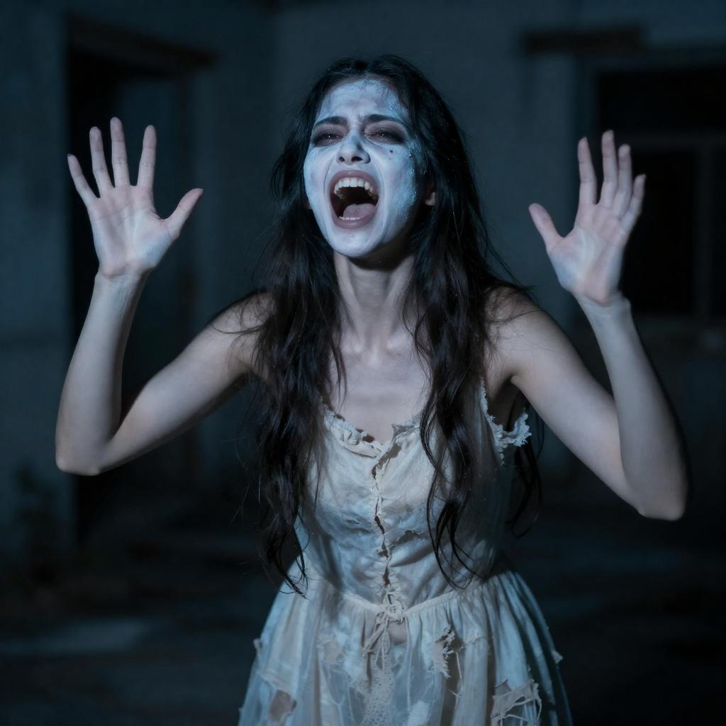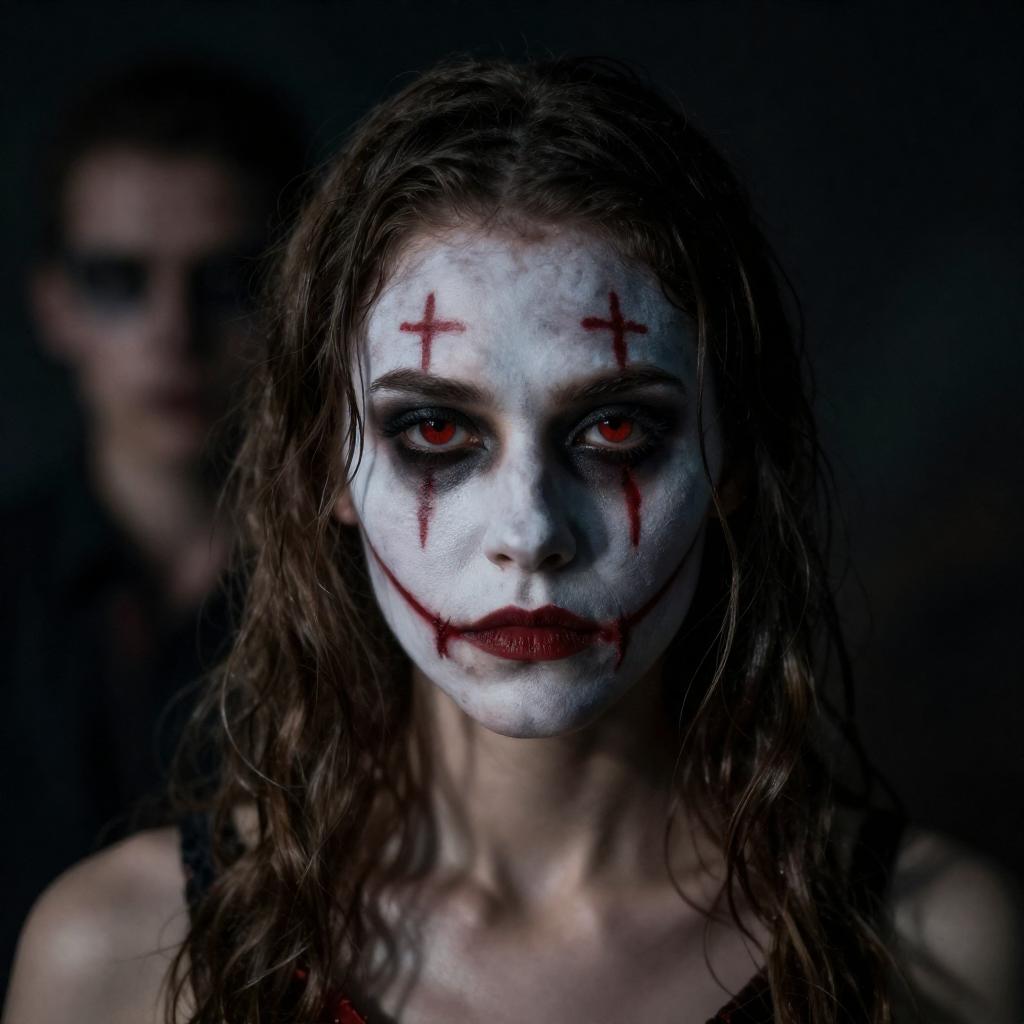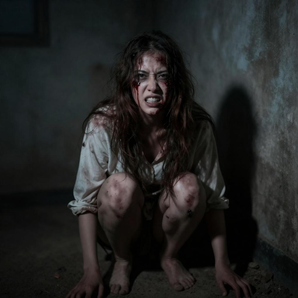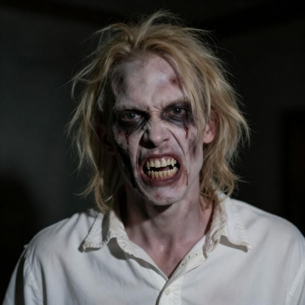 A dark, cinematic photograph of a disheveled, horror character with long, dirty hair, pale skin, and blood-stained teeth. The character's face is partially shadowed, eyes wide with a menacing glare. The background is dimly lit, enhancing the eerie atmosphere. The character's mouth is slightly open, revealing sharp teeth.