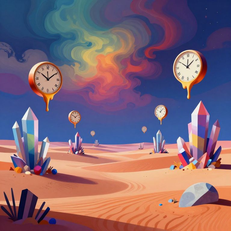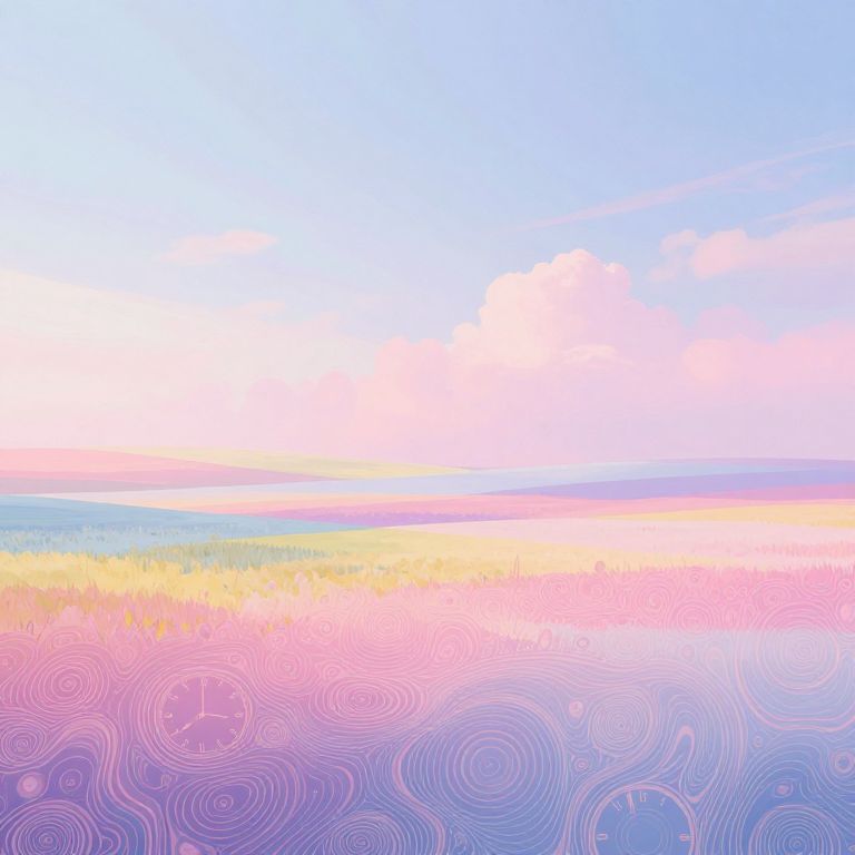 A captivating digital artwork emerges, blending surrealism with the tranquil ambiance of 'white noise.' This mesmerizing piece captures a landscape transitioning into a vibrant dreamscape from an unconventional perspective. Soothing pastels and vivid hues intermingle to evoke a spectrum of emotions as the scene shifts smoothly from serene fields under soft diffused light to an abstract realm filled with intricate patterns reminiscent of melting clocks, guiding viewers through a contemplative journey between peace and chaos.