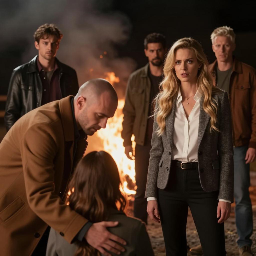 Four people in a dimly lit room. A muscular man with short brown hair in a white tank top stands center, holding a wooden spear. To his left, a woman with short blonde hair in an orange dress holds the spear's base. To his right, an Asian man with black hair in a dark shirt stands close. Another woman with dark hair, wearing a red dress and a floral crown, stands on the far right. Background includes blue walls and window frames.