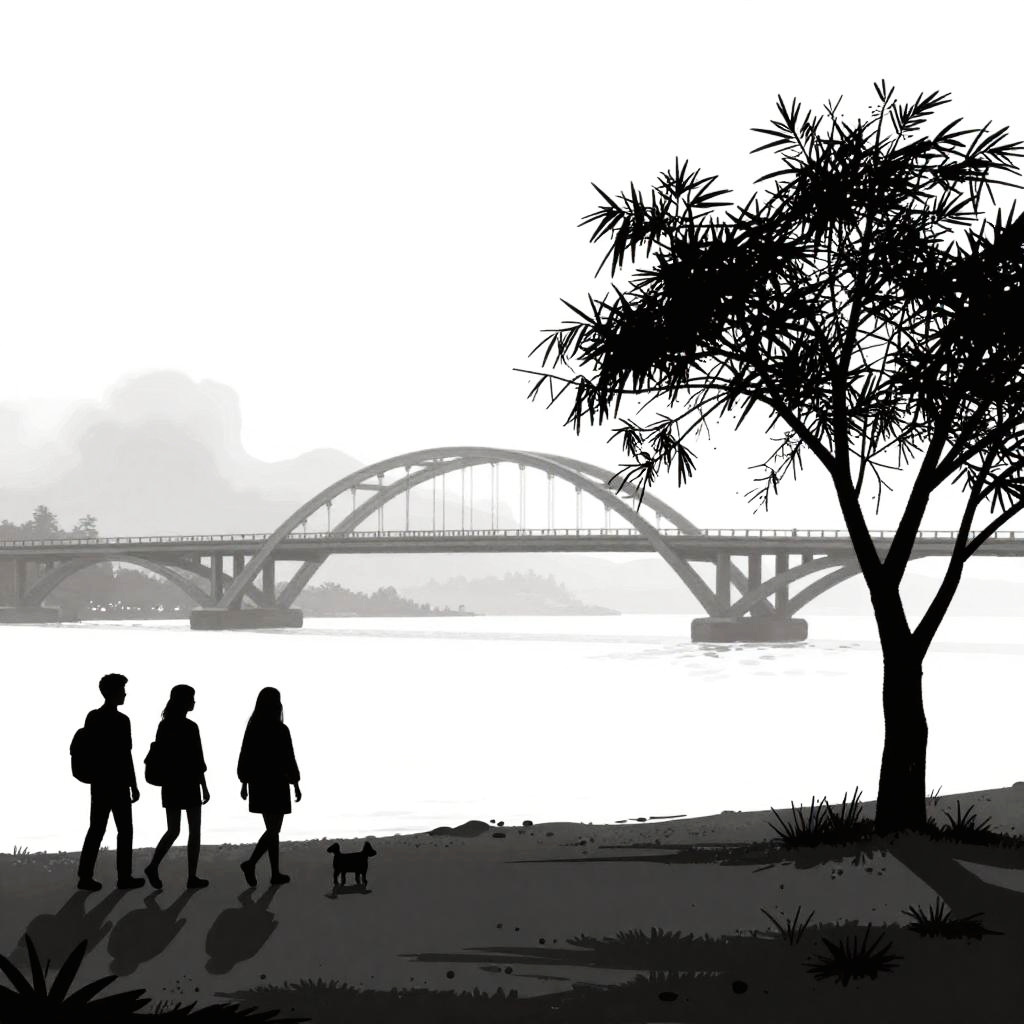 This black-and-white silhouetted digital drawing features three people walking along a beach with a small dog, accompanied by a lone tree on the right. In the background, a large, arched bridge spans over a body of water, with mist or clouds adding a dreamy effect. The sky is bright, almost white, contrasting sharply with the dark silhouettes. The scene feels peaceful and contemplative.