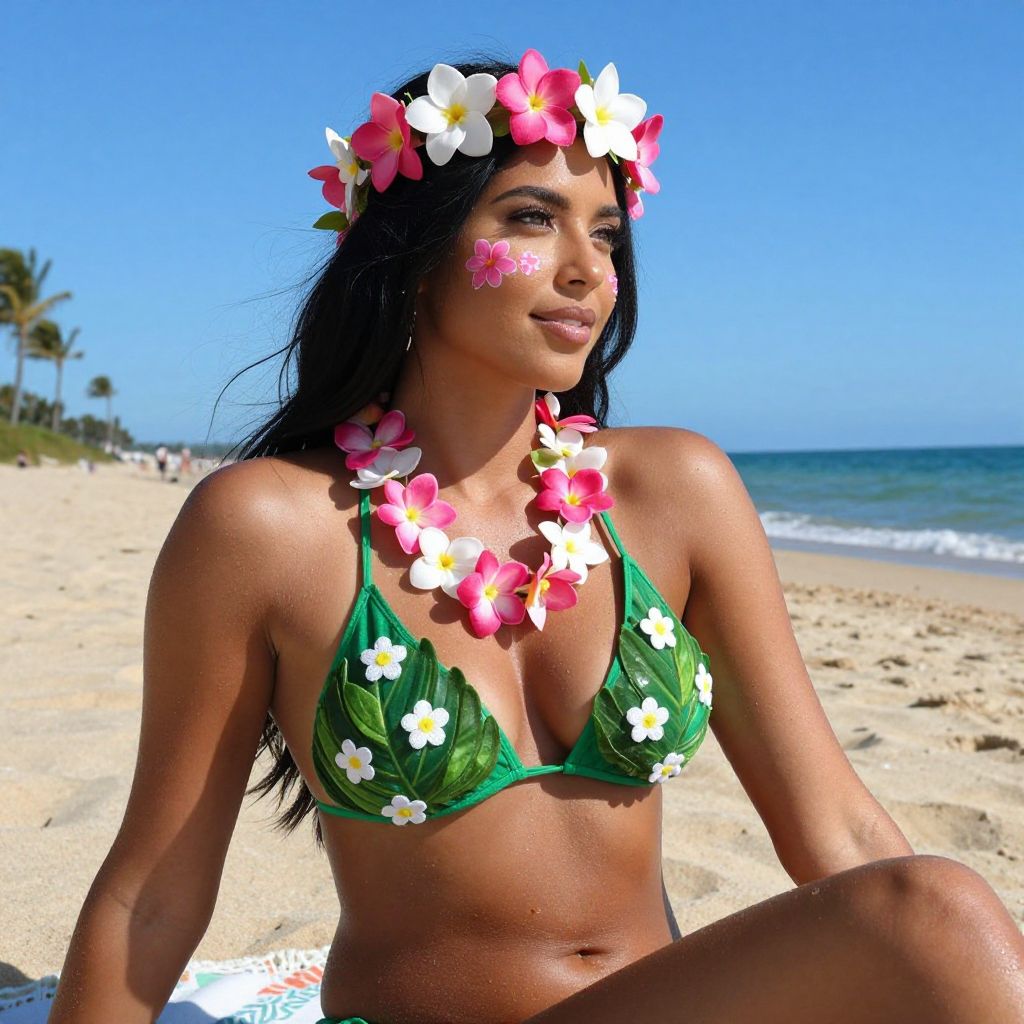 Photograph of a beautiful woman with tan skin and long black hair, sitting on a sandy beach. She's wearing a green leaf bikini top with white flowers, a pink and white flower crown, and a flower necklace. Her cheeks are adorned with pink flower patterns. The background shows a clear blue sky, turquoise sea, and a few palm trees. Bright, vibrant colors dominate the image.