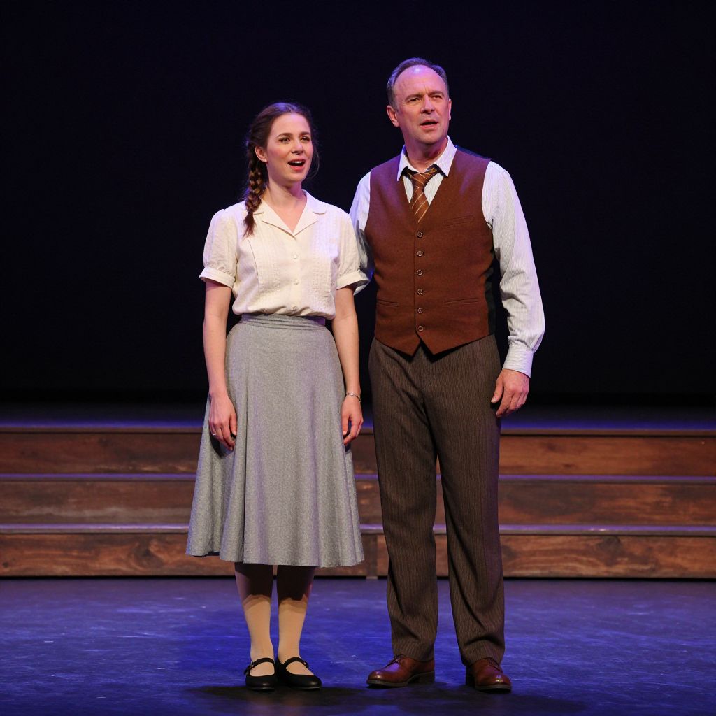 Photograph of a stage play featuring a young woman with braided brown hair, white blouse, and gray skirt, standing beside an older man in a
