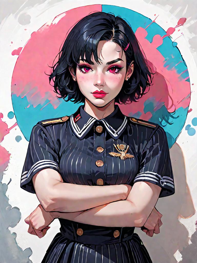 1girl, source_comics, realistic face, full body shot, Woman, minimalist modern, body-hugging mini dress in navy with thin white horizontal and vertical stripes, short sleeves, crew neckline, solid navy trim at the neck and sleeves, visible darts at the bust for shape, indoor setting with a washed-out concrete wall background.