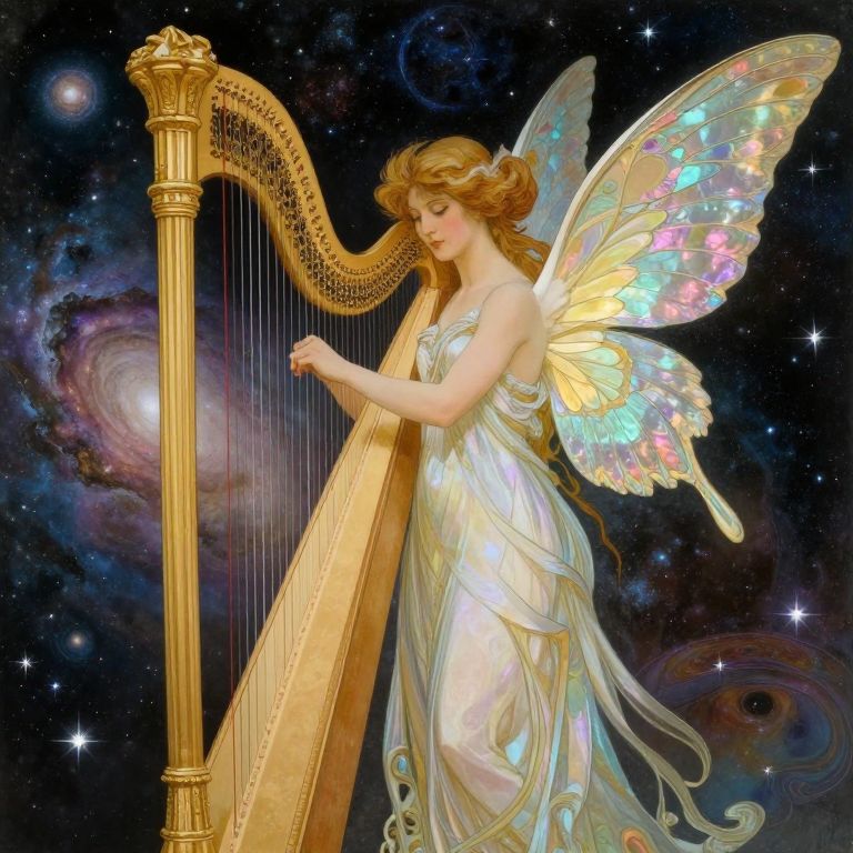 A celestial beauty with iridescent wings illuminates an otherworldly scene, reminiscent of Alphonse Mucha's ethereal style. The nymph's serene visage stands out against the backdrop of swirling galaxies and shimmering stars, as she plucks a golden harp string that resonates through the cosmos. This unique vantage point, akin to a low-angle bird's-eye view, accentuates her celestial grace amidst the vast expanse of nebulae and distant worlds.