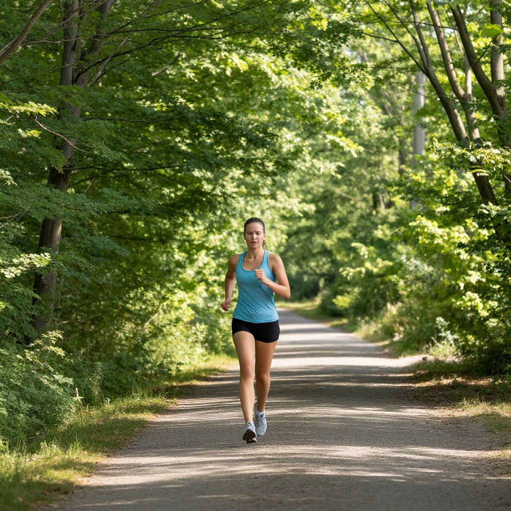 Woman jogging along a serene nature path, surrounded by lush green trees and dappled sunlight filtering through the canopy.