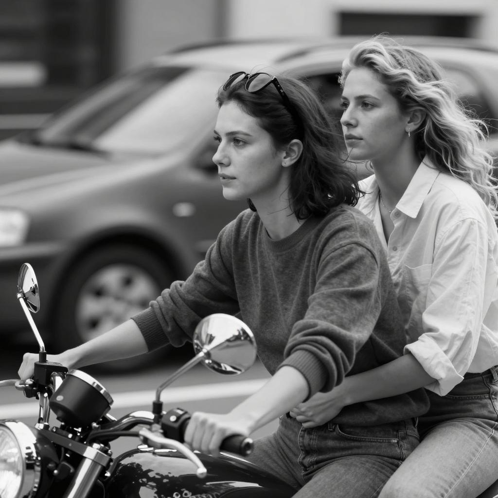 Black and white photograph of two women riding a motorcycle. The woman in the foreground has dark hair, sunglasses on her head, and wears a dark sweater, gripping the handlebars. The woman behind her has wavy blonde hair, wears a light-colored shirt, and looks to the left. A blurred vehicle is in the background. Both women have light skin. The woman in the foreground is slightly bent forward.