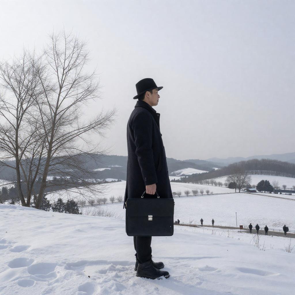Profile view of an Asian man dressed in a black overcoat and black hat, holding a black briefcase, standing on a snow-covered hill. Bare winter trees are visible to the left, with rolling snow-covered hills and sparse tree lines in the background under an overcast sky. Multiple small figures can be seen in the distance on the snowy field.