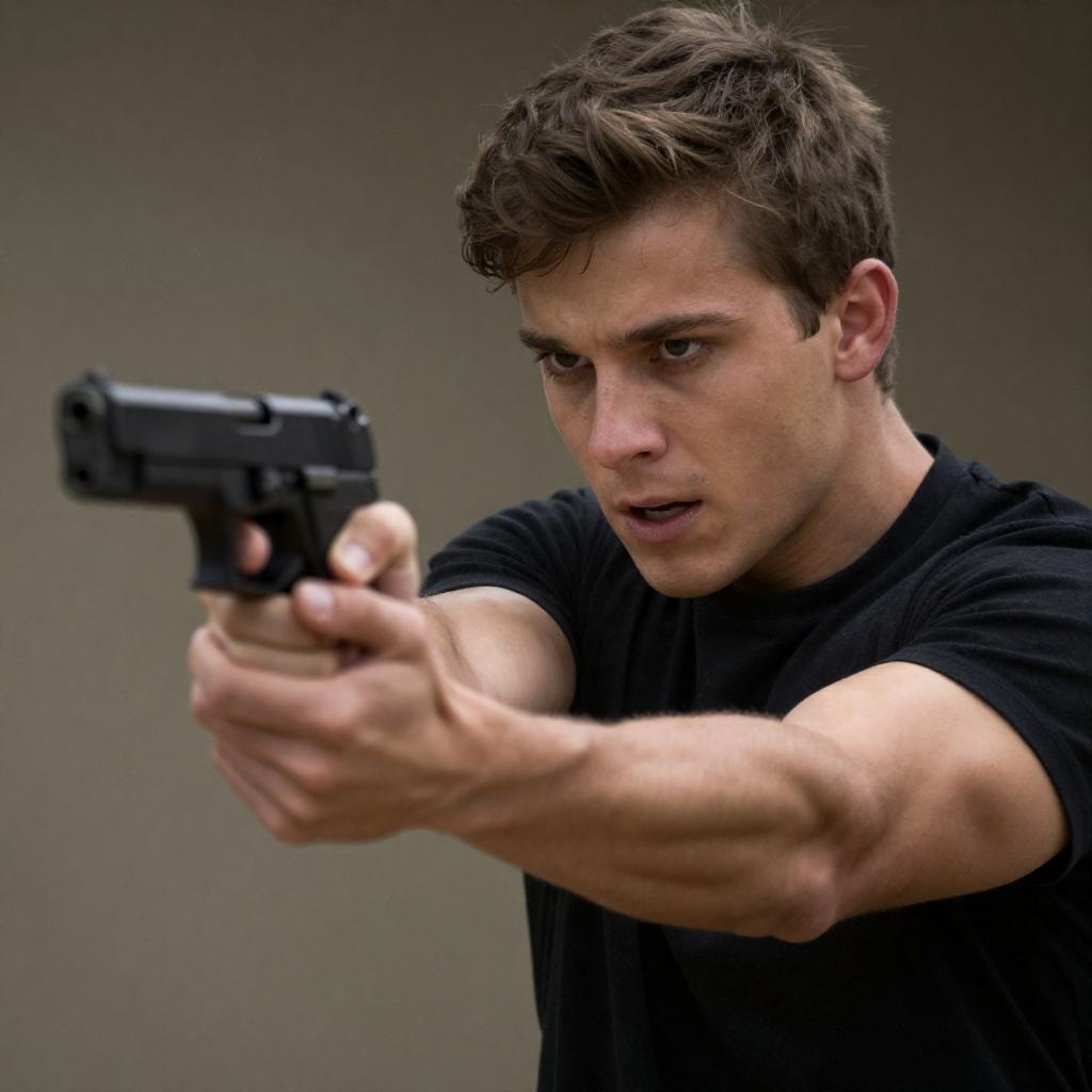 Black-and-white photograph of a young man with short, dark hair and glasses, wearing a camouflage jacket, aiming a handgun directly at the camera. His expression is focused and intense. The background is blurred, emphasizing the subject's action.