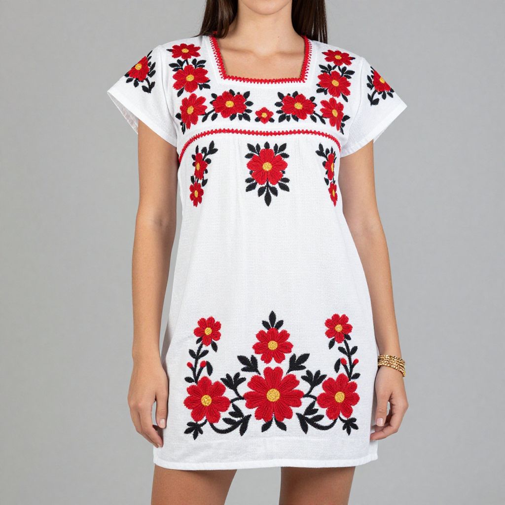 Photograph of a woman wearing a white dress with red and black floral embroidery, short sleeves, red trim, and a gold bracelet.