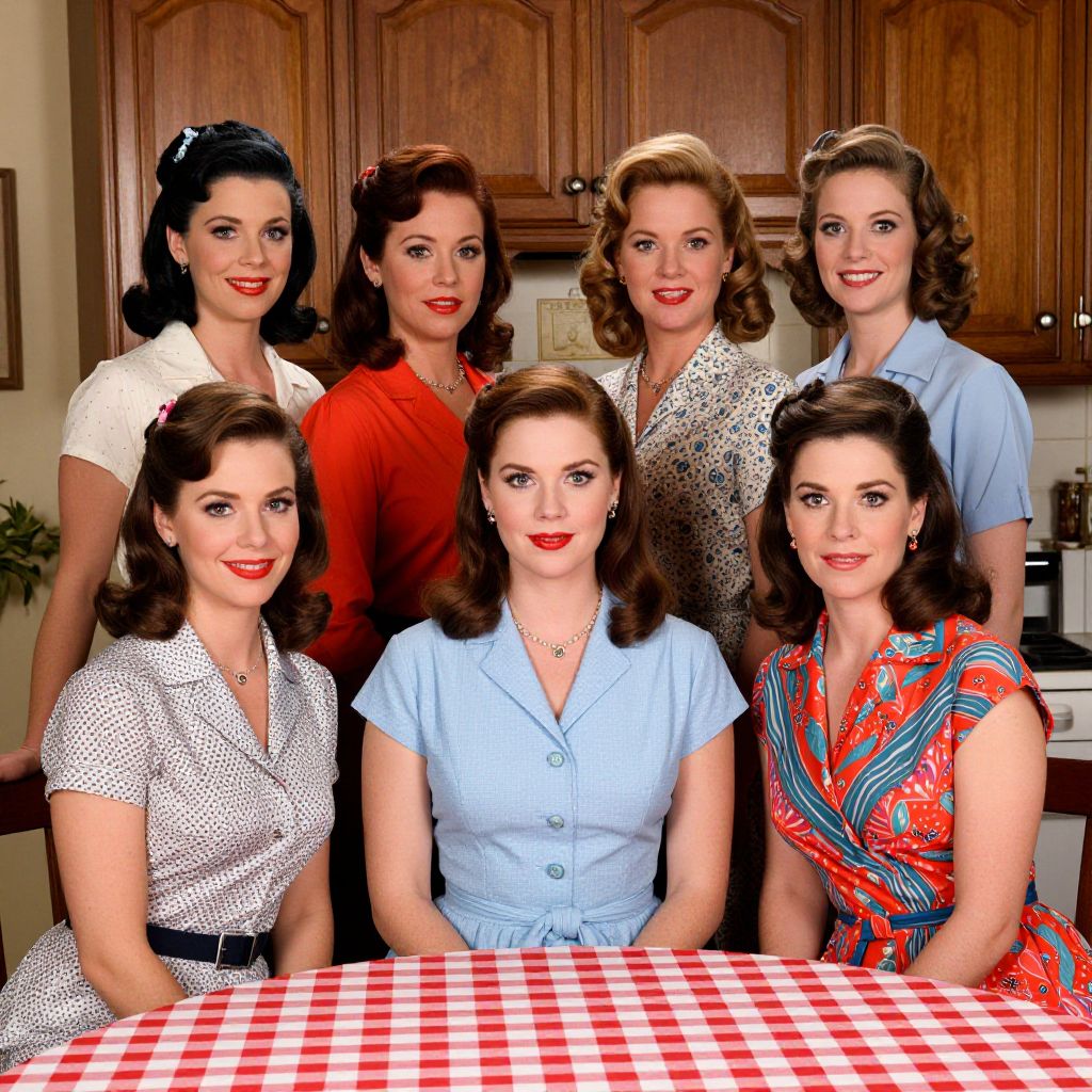 In the 1950s American setting, six women are captured in a scene reminiscent of the Real Housewives cast photo, rendered in high dynamic range (HDR) for enhanced visual detail. The women, dressed in vibrant, patterned dresses and blouses, are arranged in a semi-circle around a table covered with a red and white checkered tablecloth. The central figure, a woman in a light blue dress, sits at the forefront, with others positioned behind her, creating a layered effect. Each woman exhibits a distinct hairstyle, ranging from sleek waves to voluminous curls, adding to the period-specific aesthetic. The background features wooden cabinets and a stove, contributing to the domestic ambiance. The interplay of colors, from the rich reds and blues of the dresses to the warm tones of the wooden furniture, creates a visually engaging composition. The spatial arrangement, with the women grouped closely together yet each with their own space, reflects the social dynamics of the era.