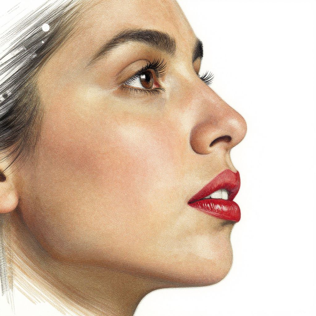 This is a highly detailed, realistic digital portrait of a young woman in profile, facing right. She has light olive skin, brown eyes with long eyelashes, and full red lips slightly parted. Her dark brown hair is pulled back, with a few strands visible. The texture of her skin is smooth with subtle freckles. The background is entirely white, making her face the focal point. The style is hyper-realistic, with meticulous attention to light and shadow, emphasizing her natural beauty. The image is sharp and vibrant, capturing the softness of her features and the glossiness of her lips.