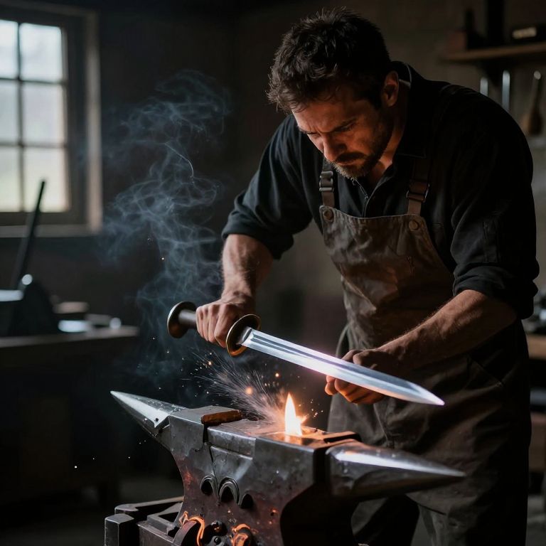 A blacksmith forges swords from whispering silence, each blade slicing light into sound.