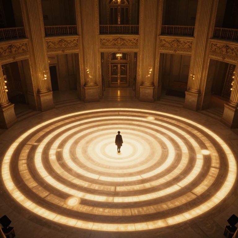 A solitary figure stands at the center of a luminous spiral dance floor, encircled by concentric rings of warm light, as if stepping into an eternal, timeless labyrinth carved into the heart of an ancient, opulent hall.