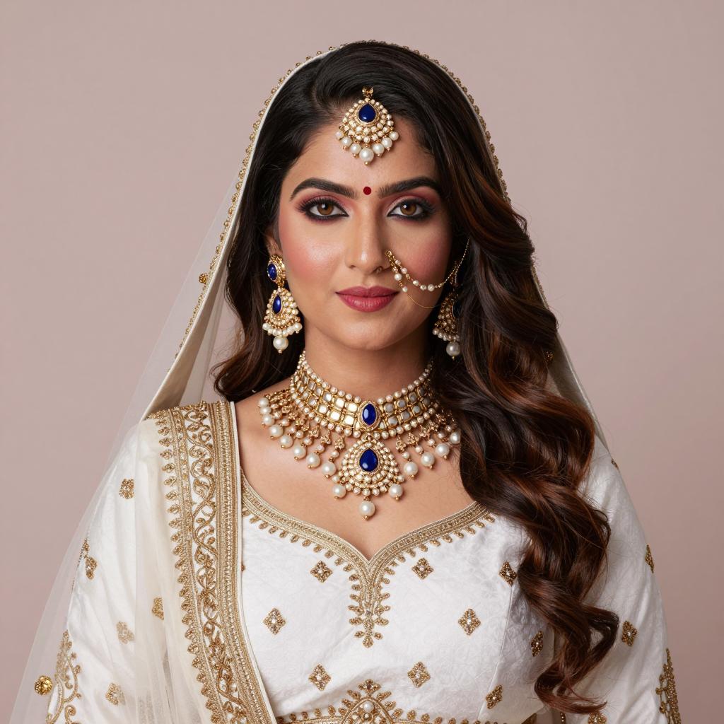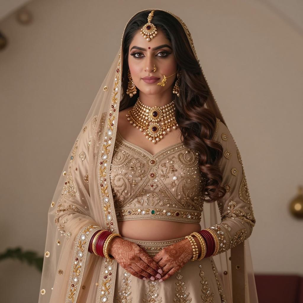 Portrait of a woman wearing a cream-colored salwar kameez adorned with gold embroidery, paired with a brown and gold dupatta draped over her head and shoulders. She has medium brown skin, long dark hair, small red bindi on her forehead, and a red necklace. The setting is a softly lit indoor room with neutral-colored walls and minimalistic decor, including a wooden cabinet and a green plant in the background. The image captures a serene and elegant expression with traditional Indian fashion elements.
