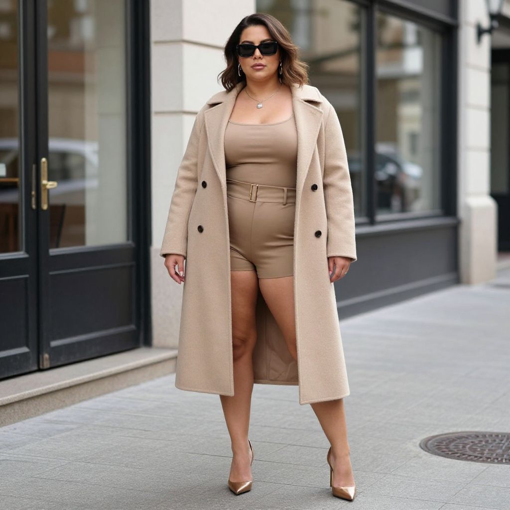 Outfit Bigger Woman Costume, woman in a long coat and shorts standing on a sidewalk