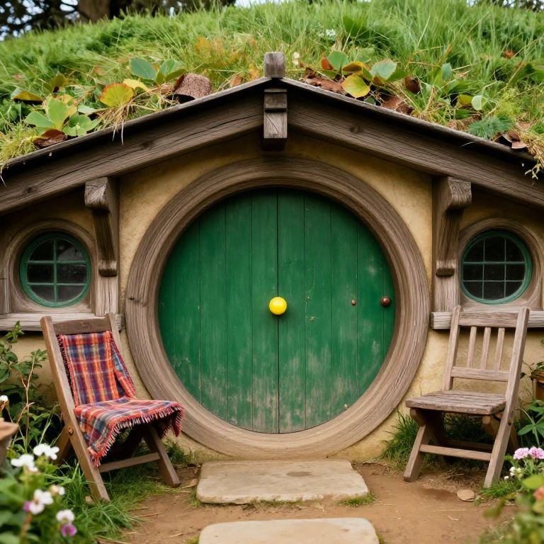Photograph of a whimsical hobbit-style house with a round, green wooden door in the center, surrounded by a circular wooden frame. The door has a small yellow knob and two round windows on either side with green frames. The house is covered in lush green grass, and the front is adorned with colorful potted flowers, a wooden bench, and a clay pot. The background features a grassy hill. The scene is vibrant and picturesque, evoking a fairytale-like atmosphere.
