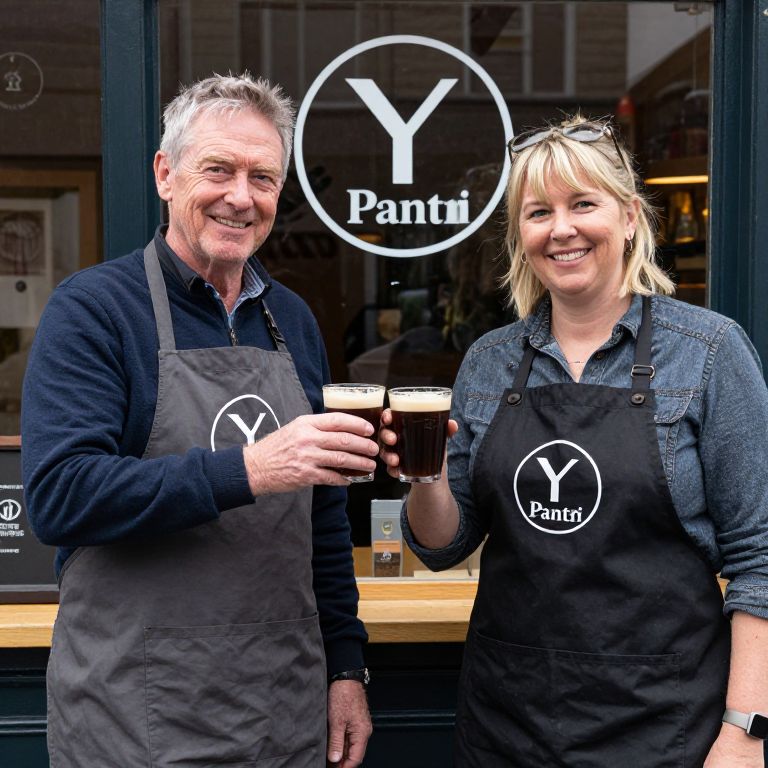 Husband and wife team Ian and Wendy Hughes, owners of Y Pantri in Llanberis, celebrate their recognition as the best North Wales coffee shop by Daily Post readers, toasting their success with glasses of dark beverages while wearing matching aprons emblazoned with the Y Pantri logo.