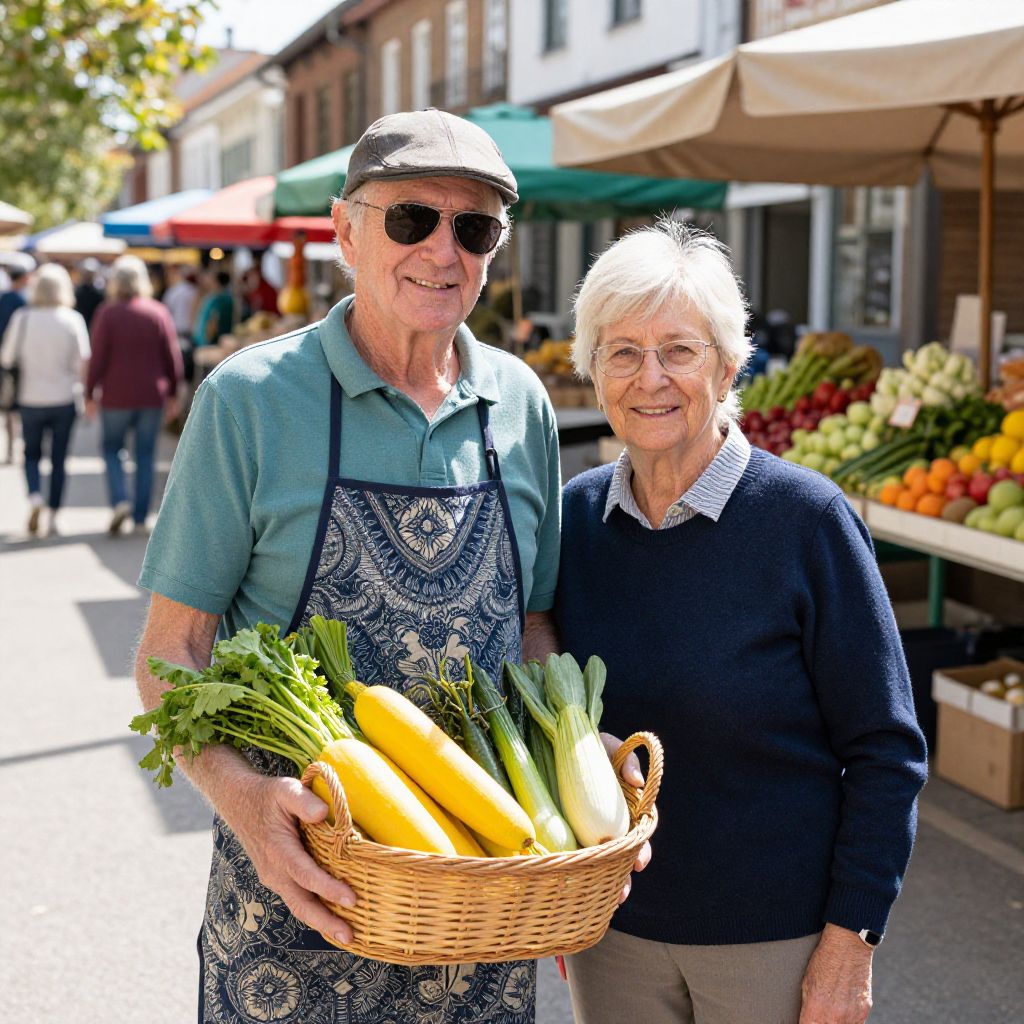 Photograph of two smiling baristas, a white-haired man and a blonde woman, standing in front of a Yumi Pantry window. Both wear black aprons with the Yumi Pantry logo and hold matching black coffee cups. The man, on the left, wears a dark blue long-sleeve shirt, while the woman, on the right, wears a denim shirt. The background shows a reflective window with blurred cityscape and interior lights. The image has a vibrant, slightly over-saturated color style, emphasizing the friendly and welcoming atmosphere of the coffee shop.