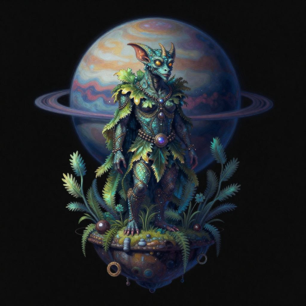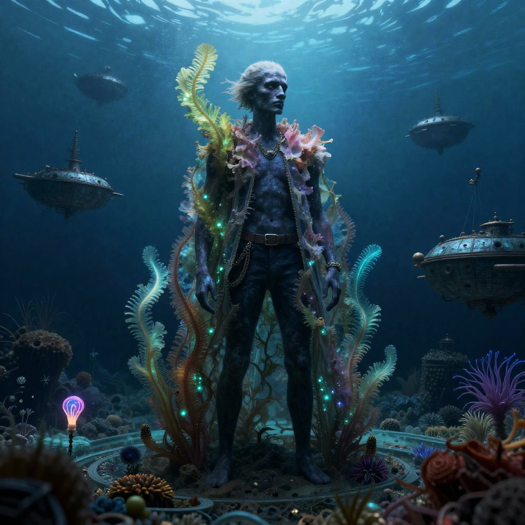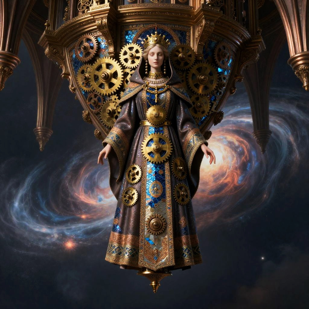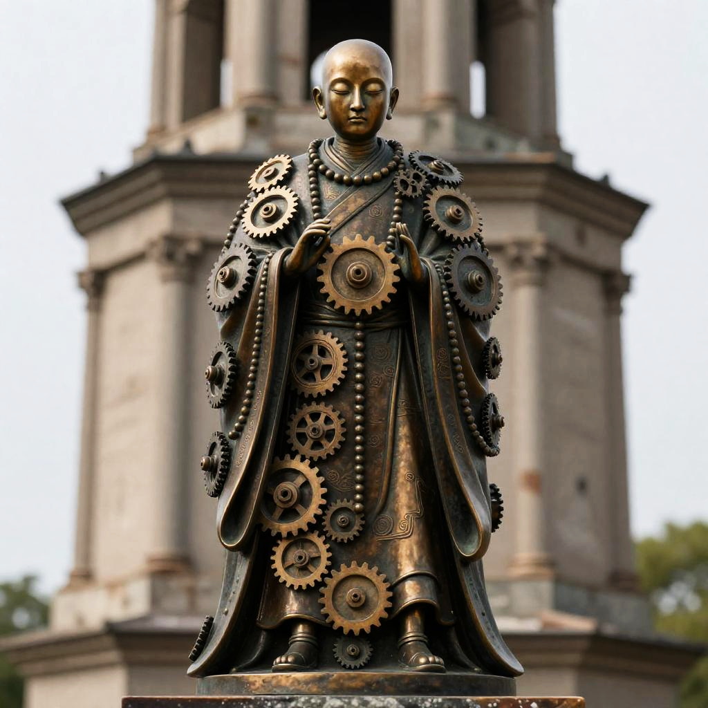 A clockwork monk draped in a cascading mantle of interlocking gears and prayer beads stands in an abandoned bell tower. This entity showcases a blend of wabi-sabi and steampunk fusion, rendered in a captivating patinated bronze sculpture.