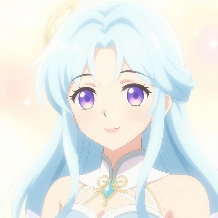 Digital anime-style portrait of a young woman with long, flowing, icy blue hair and large, sparkling purple eyes. She has a fair complexion and a gentle smile. She wears a white, high-collared top with a gold and turquoise pendant at the center. The background is a simple, bright white, making her features stand out. The art style is characterized by clean lines, vibrant colors, and a soft, glowing effect on her hair and eyes. The overall feel is ethereal and magical.