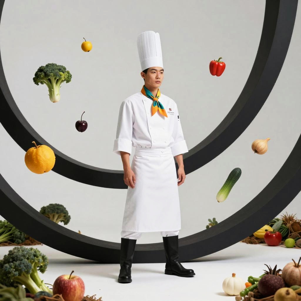 Realistic photo.A surreal fashion scene of a chef in whimsical culinary attire, set against an epic landscape with floating fruits and vegetables, dynamic low-angle composition, bold curving lines, sophisticated and clean realistic photo