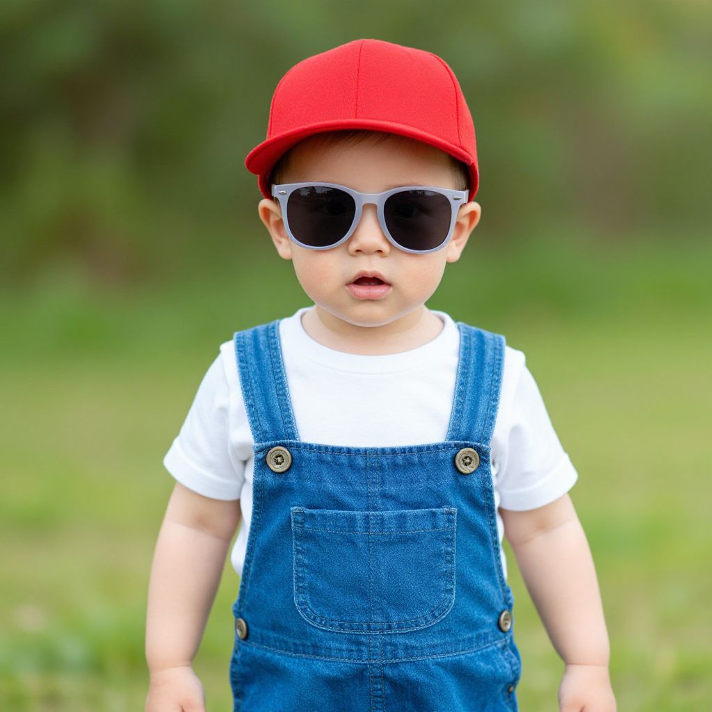 Photograph of a cute toddler with light skin, wearing a red cap, white shirt, blue denim overalls, and large black sunglasses, standing in