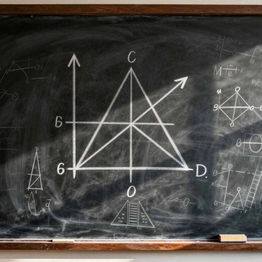 Cartesian plane with geometric shapes and vectors drawn in chalk on a blackboard, detailed mathematical annotations, soft natural light casting shadows, vintage classroom setting, emphasis on symmetry and clarity, educational and artistic fusion