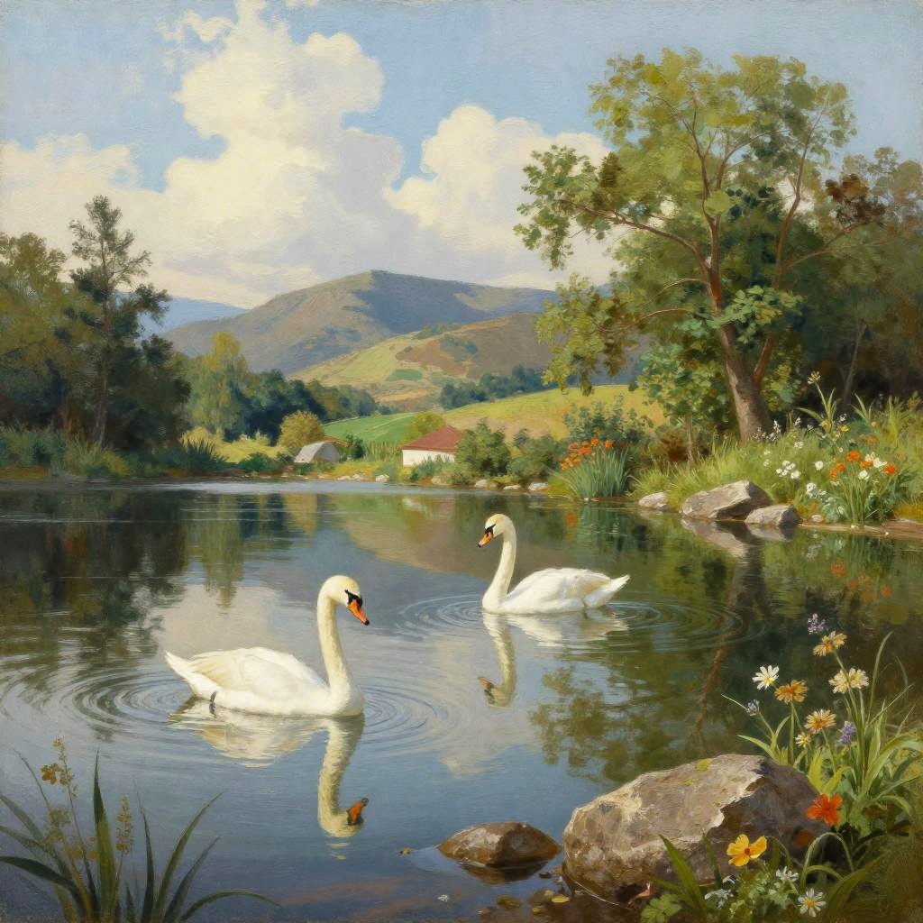 Serene Landscape with Swans and Hills