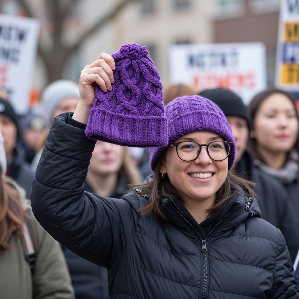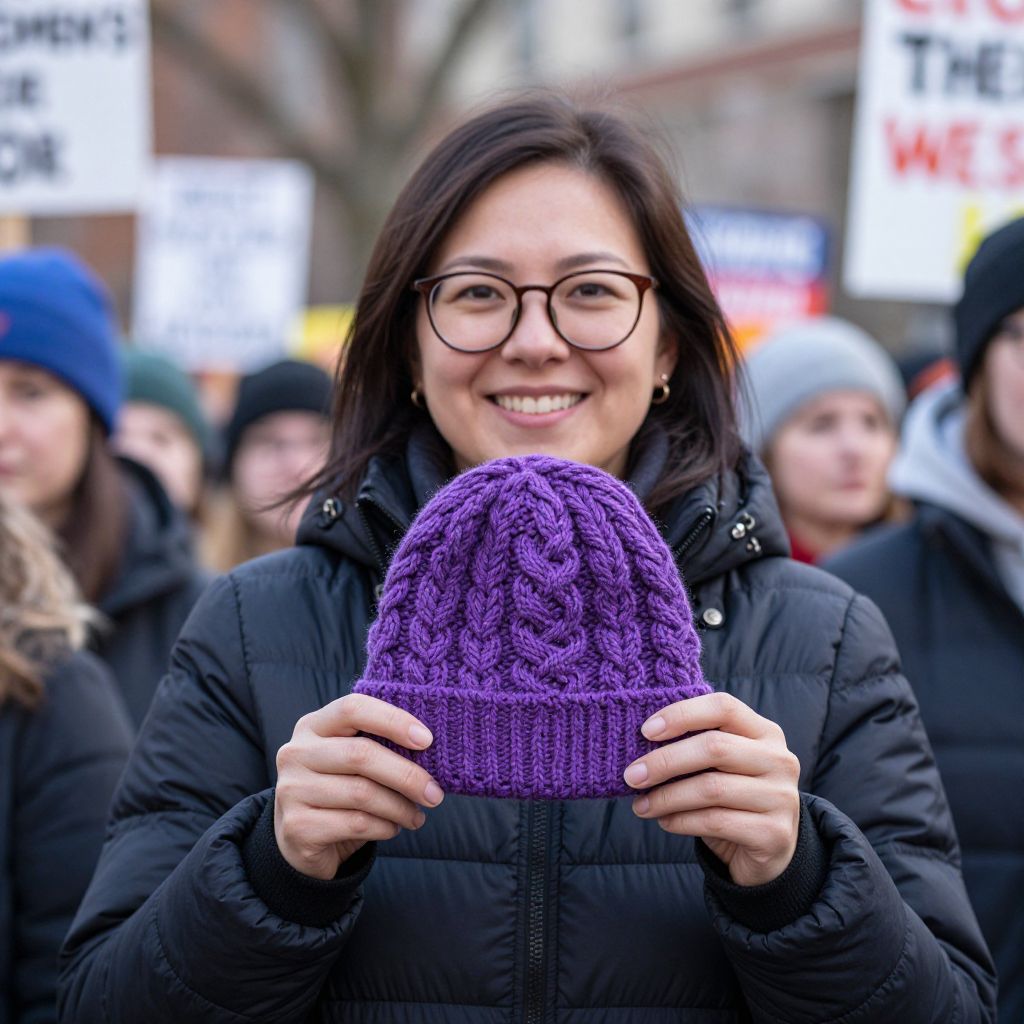 Smiling woman wearing glasses and a black puffer jacket holds a vibrant purple knitted hat featuring intricate cable patterns, showcasing her contribution to the Women's March in Washington, D.C., as part of a collective effort to provide warmth and solidarity for women's rights.