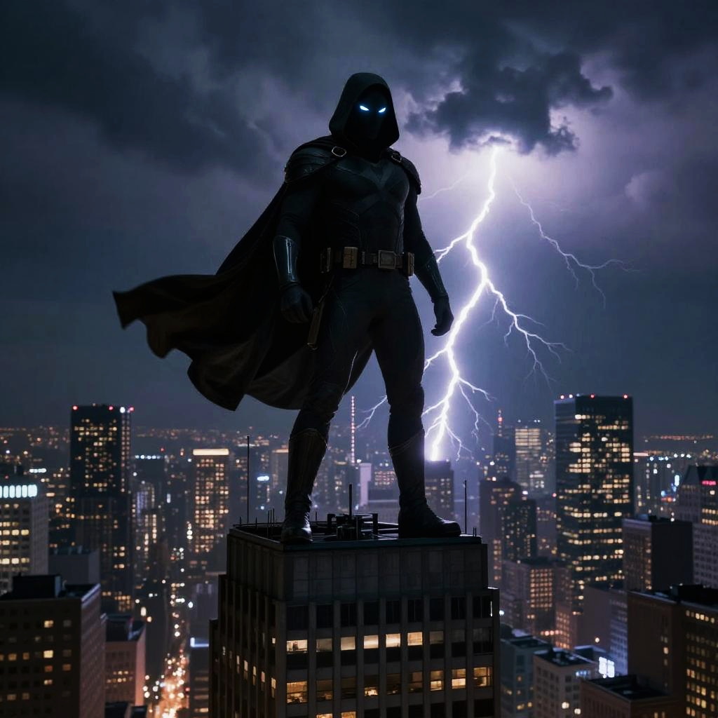 Dark marvel image showcasing a shadowy superhero standing atop a skyscraper in a stormy cityscape, lightning illuminating the dark clouds behind, deeply detailed costume with glowing eyes, intense atmosphere with cinematic shadows and moody colors.