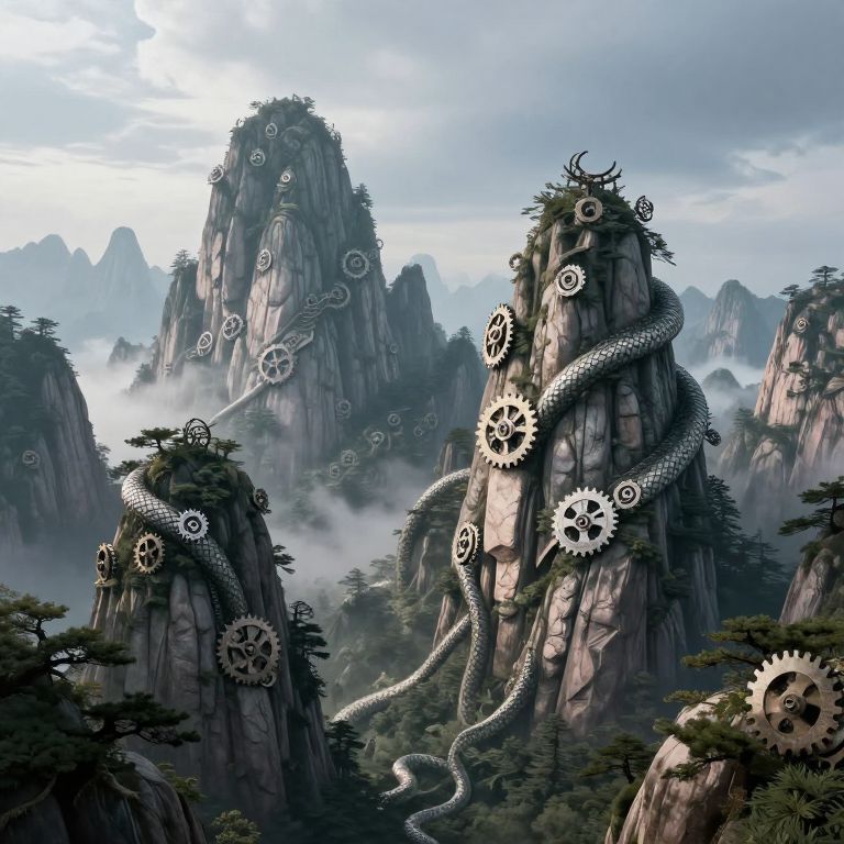 Twisted mountains rise like ancient serpents, their peaks adorned with ethereal gears that hum in celestial harmony, weaving a tapestry of timeless wonder and introspective awe.