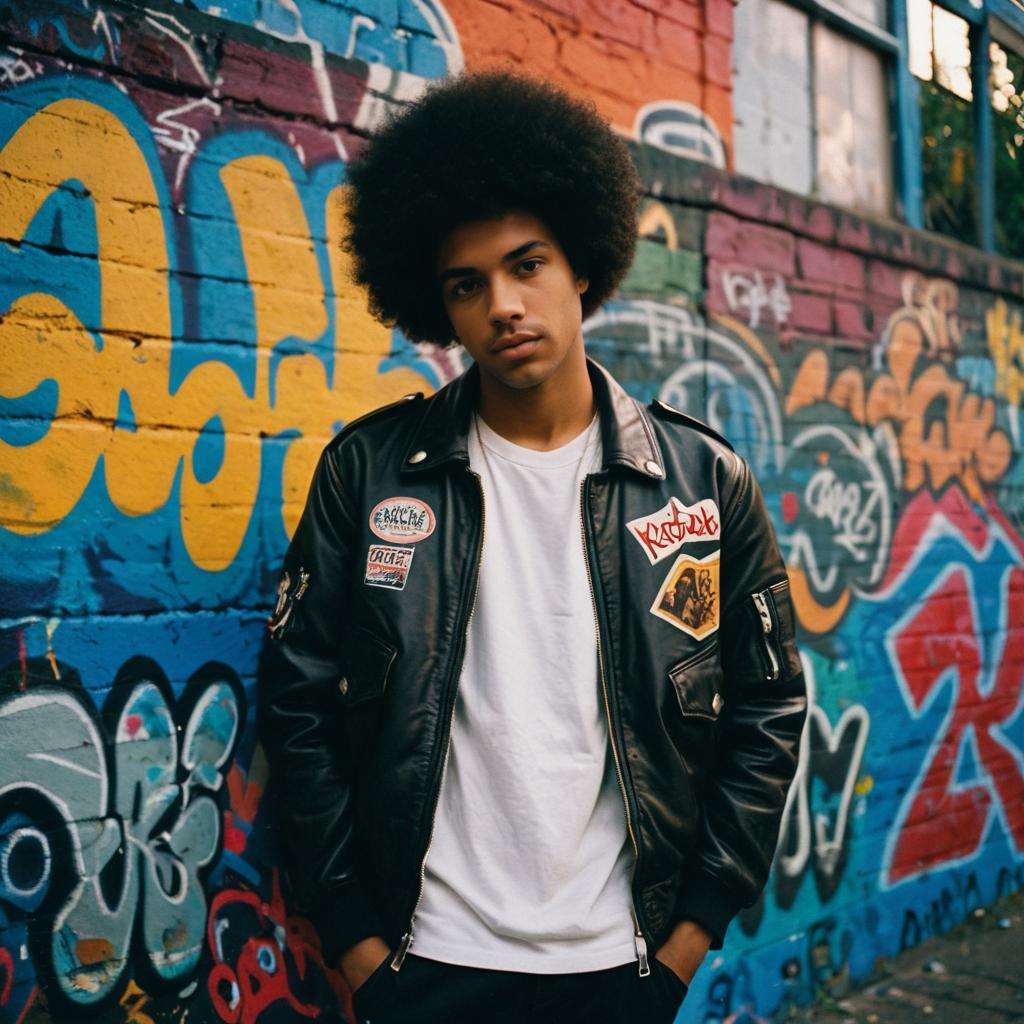 Portrait of a young man with an afro hairstyle, wearing a vintage black leather bomber jacket and a white t-shirt. He is leaning against a colorful graffiti-covered wall during dusk, creating a moody and atmospheric urban vibe.