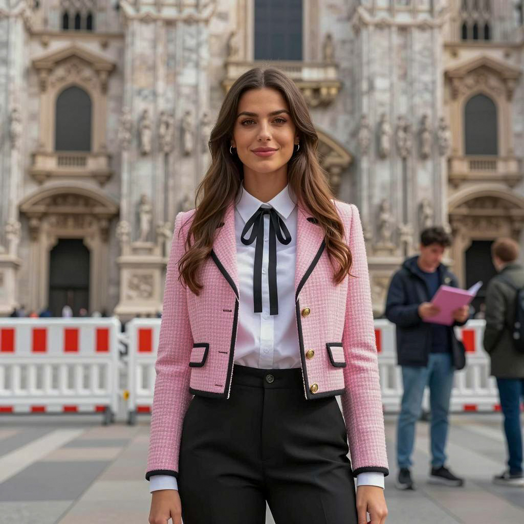 Woman with long brown hair, pouting lips, wearing a pink ured blazer and matching skirt, white handbag with gold chain, standing against a columned building, hands near chest, pink nails, urban street background, daytime, full-body shot.