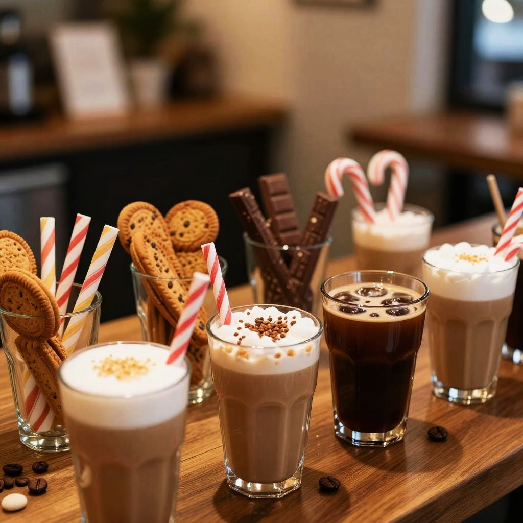 A variety of edible coffee stirrers including cookie, chocolate, and candy cane styles, showcased in clear glass cups filled with different coffee drinks, illuminated by warm, inviting café lighting.