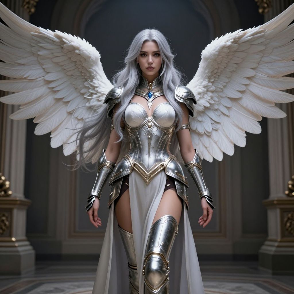 A strong woman with long, flowing silver hair and large angel wings stands in a dimly lit room, her body adorned with intricate armor and a slim waist, exuding an aura of power and grace.